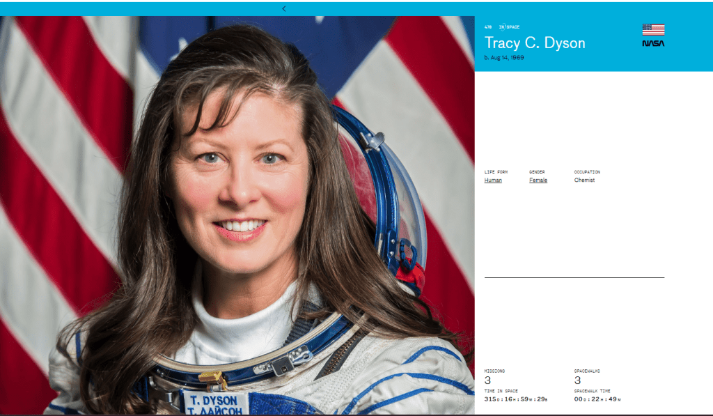 14 August 1969 Tracy Caldwell Dyson (NASA) US. One of supercluster.com’s amazing feature is that it informs you if the astronaut is currently in space when you go to their page. Dyson is currently in space (spot the ‘IN SPACE’ gif above her name):