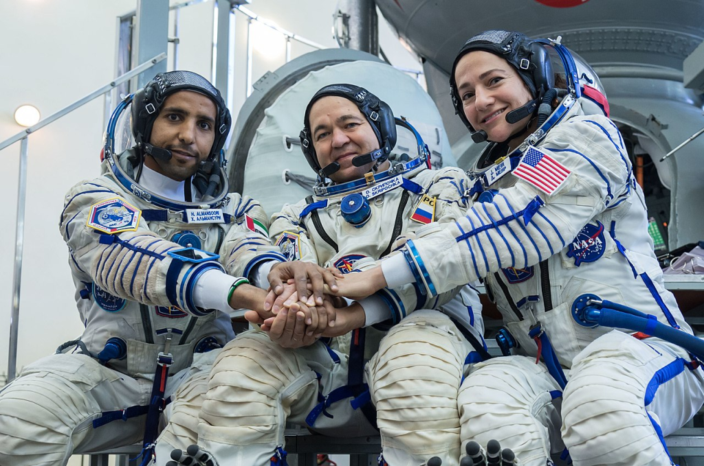 Meir (right) and her Soyuz MS-15 crewmates Hazza Al Mansouri (left) and Oleg Skripochka (centre)